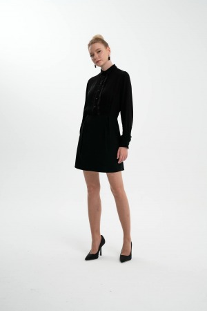 Gömlek yaka tasarımı ve bluz kısmında yer alan düğme detayları, elbiseye modern bir hava katıyor. Düğme bölgelerindeki fırfırlı grogren pilise detaylar, hareketli ve zarif bir görünüm sunarken, etekte yer alan çift pilise ve yandan fermuar detayı sayesinde kullanım kolaylığı sağlanıyor.