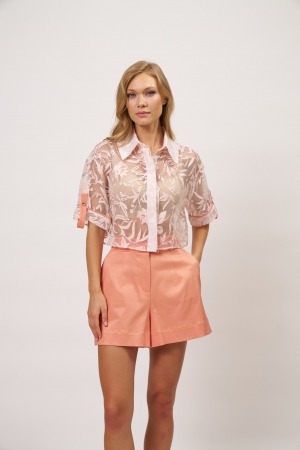 Şıklığın ve özgün tasarımın buluştuğu M7K Destina Salmon Shirt, şifon kumaş üzeri lazer yakma desenleri, yakalı ve önden düğmeli tasarımı ile stilinize sofistike bir dokunuş katıyor. Biyeli detayları ve apolet aksesuarlı kısa kolları, gömleğe hareket katarak modern ve dikkat çekici bir görünüm sunuyor. Kısa krop kesimi, yüksek bel pantolonlar ve eteklerle mükemmel uyum sağlayarak stilinizi tamamlıyor.