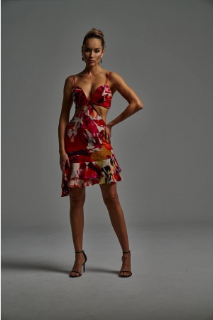 İp askılı ve bralet üst detayları elbiseye feminen bir dokunuş katarken, bel yanlarındaki dekolte ve arka sırt dekoltesi modern ve iddialı bir görünüm sağlar. Etek ucundaki volan detayı, elbiseye hareketli ve romantik bir hava ekleyerek dinamizmi artırır.