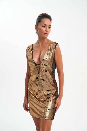 SIRT VE GÖĞÜS DEKOLTE GOLD PULPAYET MİNİ ELBİSE